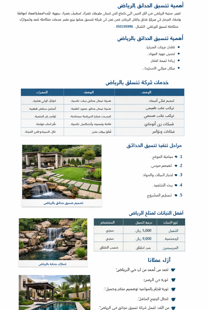 ومن هنا تأتي أهمية اختيار شركة تنسيق حدائق بالرياض تمتلك الخبرة والمعرفة بطبيعة المناخ الصحراوي، وأنواع النباتات المناسبة، وأنظمة الري الحديثة التي تضمن استدامة المساحات الخضراء طوال العام.